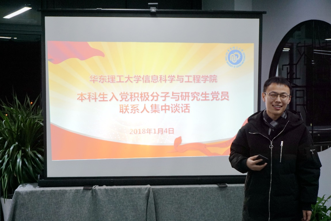 1月4日晚上,必赢76net线路唯一官方网站组织完成第26期入党积极分子培训班的新一期本科生入党积极分子与对应的研究生入党联系人进行首次集中谈话活动。活动在奉贤校区实验一楼阳光育人平台举行,近20余名学院17级硕士研究生党员担任此批本科生入党积极分子联系人,本科生党建负责老师张驰参加了谈话活动。